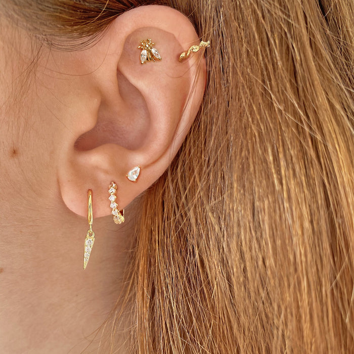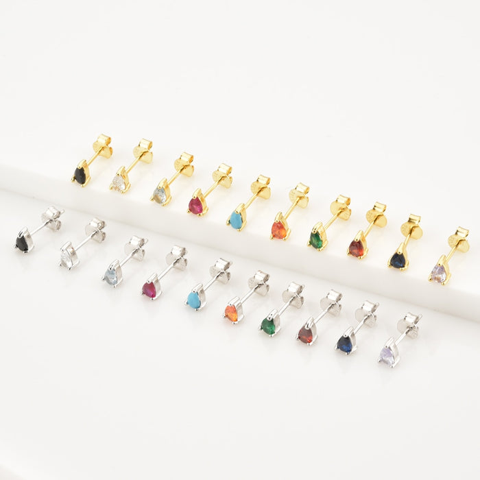 Pareja de pendientes de tipo botón con una circonita incrustada en forma de lágrima.