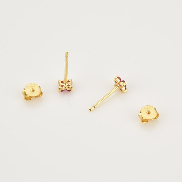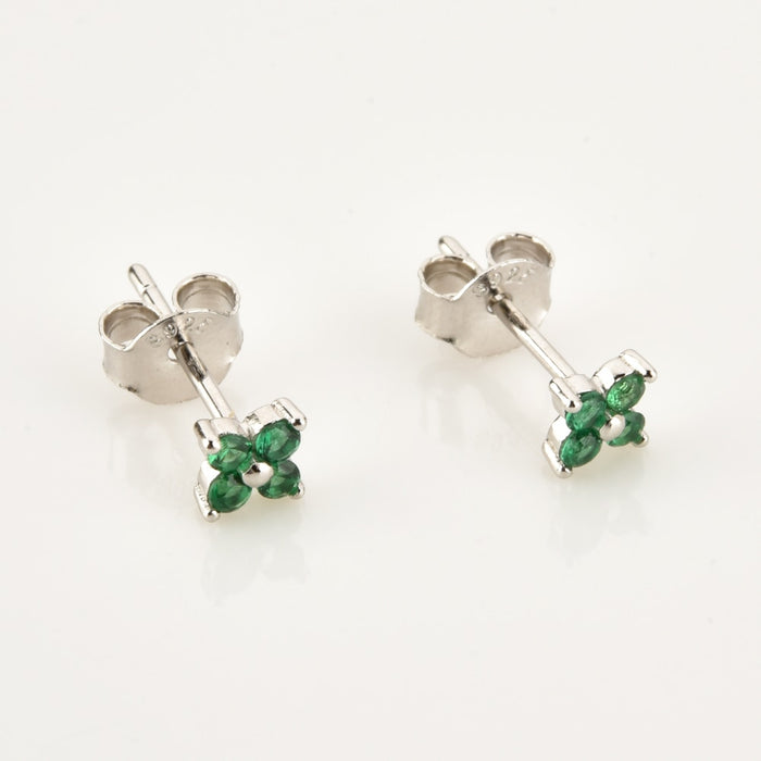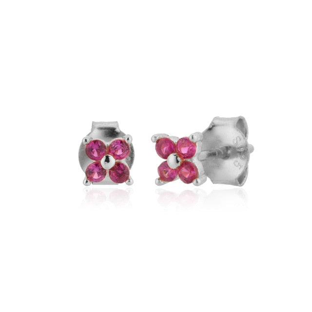 Pareja de pendientes de cierre de tipo botón con un diseño de flor. Está realizado con cuatro circonitas incrustadas.
